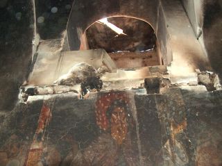 Косово и Метохия: поруганные святыни.  Храм Богородицы Левишской в Призрене после погрома. Март 2004 г.