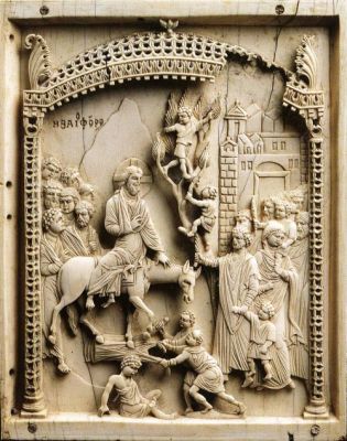 Источником иконографии Входа Господня в Иерусалим является Евангелие, где рассказывается о том, как Христос, сидя на молодом осле, в сопровождении учеников накануне иудейской пасхи въезжает в город, в котором Его предадут на распятие. Изображения едущего на осляти Спасителя известны уже в раннехристианском искусстве.