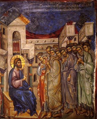 Holy and Great Thursday. The Mystical (Last) Supper. Early 14th c. Fresco in Vatopedi Monastery, Mt. Athos.