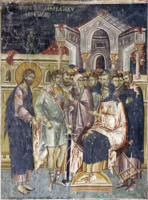 Holy and Great Friday. Christ being questioned by Caiaphas the high priest. Fresco in Staro Nagoricno, Macedonia. 12th-14th c.