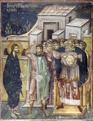 Holy and GreatFriday. Christ at the judgment hall of Pilate. 6th c. Miniature from the Rossano Gospels. Rosano museum, Italy.
