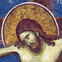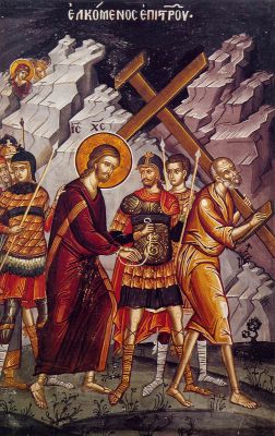 Holy and Great Friday. Simon the Cyrenean helps the Lord carry His cross. Fresco in Cyprus.