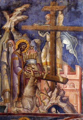 Holy and Great Friday. Christ nailed to the Cross. Fresco in Dionysiou Monastery, Mt. Athos.