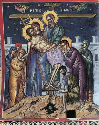 Holy and Great Friday. Taking Christ down from the Cross. Amenian book miniature. 8th c.
