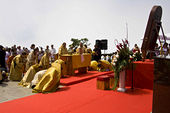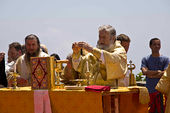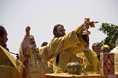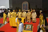 Божественная литургия совершалась при пении хора московского Сретенского монастыря под открытым небом, у подножия статуи Христа Спасителя. На горнем месте была установлена привезенная из России чудотворная икона Божией Матери «Державная».