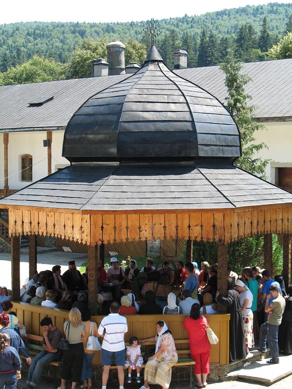 Смотритель монастырского музея отец Клеопа рассказывает паломникам историю обители