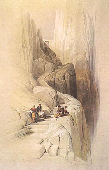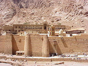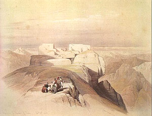 Трифон Коробейников упоминает в своем хождении уже только одну церковь во имя пророка Илии, «над тем местом, [г]де Илья постился и вранове ту пищу приношаху; а вранове тут живут не велики добре».[47] Вряд ли можно сомневаться, что речь идет о церкви, построенной грузинским царем Давидом II в начале XII в. над пещеркой, в которой, по преданию, скрывался пророк Илия (3 Цар 19, 8–18). Эту пещерку посещал еще Блаженный Антонин, бывавший на Синае в конце VI в. А церковь видели, помимо Варсонофия и Коробейникова, путешественники Петр Делла Валле (1645), Тевенот (1658), Морисон (1697), о. Василий Барский (1728), Нибур (1762) и пр., согласно сведениям архимандрита Порфирия[48]. Церковь расположена на высоте 2 137 м над уровнем моря перед небольшим озером и колодцем с питьевой водой. Варсонофию здесь очень понравилось: «Бе бо поляно место красно… И ту ж есть вода, озерце кругло, омуровано камением. И круг воды древеса…» Разумеется, Варсонофий «от» этих деревьев «посох урезах». Вероятно, именно с этим посохом на следующий день он поднимался «на гору велми высокую же» — высота 2642 м над уровнем моря. На этой горе «лежало святое тело великия мученици Екатерины, и принесено святыми ангелы от Александрия града по святом ея страдании за Христа» (нач. IV в.).