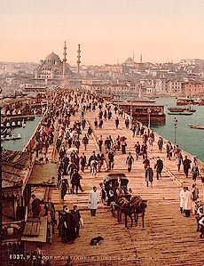 Не мешало бы еще при входе на мост открыть и контору страхования жизни. Жутко идти по мосту. Так и кажется, что сейчас провалишься и будешь купаться в чудесных волнах Золотого Рога. Некоторые доски гнутся и скрипят, когда на них наступаешь. А под мостом, будто в аду, кишат люди, пароходы и пароходики. С левой стороны моста целый ряд пароходных пристаней; постоянно подходят и отходят всевозможных типов и размеров пароходы, слышны беспрерывные свистки, шум колес, нарушающих зеркальное спокойствие тихих вод залива, воздух наполнен вонючим, препротивным запахом дыма от скверного каменного угля.