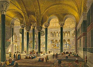 Вот мы идем по Стамбулу. Здесь тише, меньше народа, меньше движения. Улицы, по крайней мере некоторые, пошире и даже иногда обсажены деревьями. В тени деревьев сидят торговцы, раскинуты кофейни; даже собаки бросают свое стоическое равнодушие к палящим лучам солнца и предпочитают лежать в тени. Слепо доверившись своим проводникам, безропотно шли мы за ними, в какие бы переулки они нас ни заводили. И нашему Сусанину нетрудно было бы здесь куда-нибудь завести ляхов злых на погибель. Наконец мы дошли до Святой Софии. Смотришь и глазам не веришь. Да уж та ли эта София, о которой мы слыхали и читали больше, чем о каком-либо другом храме в мире? Какая-то груда желтого камня, беспорядочно нагроможденного. Во многих местах заметны следы разрушения. Памятник содержится неопрятно. Даже не видно и особенно подавляющих размеров храма. Впрочем, мы уже слыхали, что совне Святая София не производит почти никакого впечатления, кроме разочарования. Но не менее хорошо мы знали также и то, что под этой грудой камней скрывается величайшее произведение византийского архитектурного гения, от которого приходят в восторг все его видевшие, начиная с наших древних паломников. «О Святой Софии Премудрости Божией ум человечь не может ни сказати, ни вычести» (Стефан Новгородец). «Величества и красоты ея не мощно исповедати» (дьяк Александр, XIV в.). «Досточудный и прехвальный храм Святой Софии — земное Небо, новый Сион, похвала вселенныя, слава церквей» (Григорович-Барский). «Ум человеч пременился, такое диво видевши, что уже такова дива в подсолнечной другова не сыщешь» (Иоанн Лукьянов). Это такой храм, вокруг которого создалась целая библиотека ученой литературы. Это храм, который имеет свою длинную историю, разукрашенную поэтическими и легендарными сказаниями, на которые столь таровато было во все века византийское пылкое воображение.
