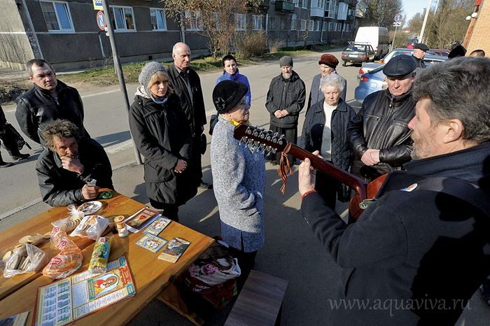 Сегодня на акции присутствует и Антон Галицкий — довольно известный бард-исполнитель, преподаватель факультета психологии СПбГУ. Он давно знаком с отцом Сергием Рысевым, и тот пригласил его поучаствовать в проекте — благо, что ранее этим же днем Антон Галицкий давал концерт в Новолисинской школе-интернате. Почему бы и не спеть для бабулек в Тосно? Тем более что многие из них приходят к бане не за гречкой и даже не ради медосмотра — а просто пообщаться. Репертуар у Антона Степановича широкий — от современных авторских песен до русских романсов. Поэтому общий язык с бабушками он находит легко: сначала они вместе затягивают «Родник» иеромонаха Романа (Матюшина), потом — дружно подхватывают «Стою на полустаночке», «Что стоишь, качаясь», песни военных лет.