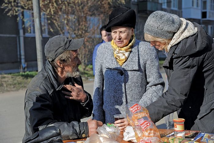 Но откровенно неблагополучных людей здесь немного, большинство все-таки обычные пенсионеры. Сюда они приходят не в последнюю очередь за медицинским осмотром, например, чтобы проверить уровень сахара в крови. В поликлинике нужно отстоять очередь, а не хочешь очереди — иди в платную клинику. Здесь же, на акции «Учимся милосердию», и бесплатно, и очередей нет.