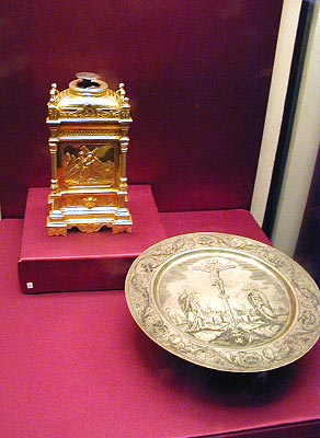 Гвоздь от подножия Креста Господня в ковчеге и дискос на котором святыня выносилась для поклонения.