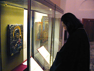 Икона Божией Матери Влахернская, подаренная патриархом Иеремией в 1589 г. в знак благословения Русского патриаршества. К иконе прилагается грамота патриарху Иову, заверенная печатью. На переднем плане - копия Влахернской иконы из воскомастиха, обнаруженная в 19 веке во Влахернском храме в Измайлово.