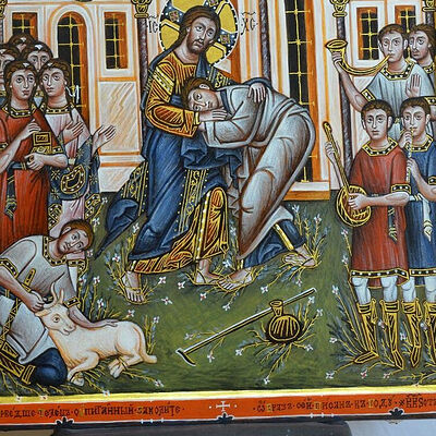 На иконе все происходит на фоне дома. Он неслучайно занимает важное место в изображении и композиционно все обьединяет. Это дом Отца, в который возвращается сын.