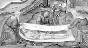 Вот как повествует об этом Евангелие от Марка: Иосиф Аримафейский, один из тайных учеников Христа, купив плащаницу и сняв тело Господа со креста, обвил плащаницею и положил во гробе, который был высечен в скале, и привалил камень ко двери гроба.