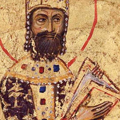В простой одежде он стоит на иконе новомучеников Маккавеевских.