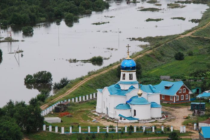Наводнение, 2013 г. Село Константиновка. Храм равноапостольных Константина и Елены. Вид с вертолета МЧС