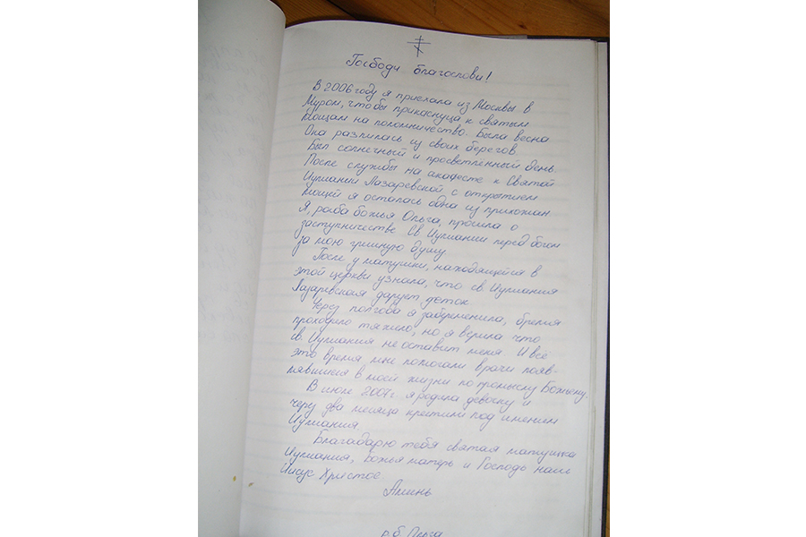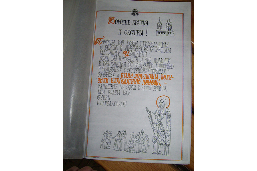 Среди многочисленных записей об исцелении больной ноги или поясницы есть и совсем удивительные. Вот молодая мать благодарит матушку Иулианию, что даровала ей дочку после долгих лет ожидания и лечения. Другая женщина поклоняется святой, что помогла ей выносить ребенка. А вот паломница из Челябинска пишет, как был ей сон, а в нем незнакомая церковь и стол в ней без скатерти. И было ей видение сшить ту скатерть. Много месяцев откладывала она дело, не умея ни шить, ни вышивать. Но вот по делам приехала в Муром, и как увидела храм Николы-Набережного, вспомнила сон свой, узнала церковь, купила ткань, брала уроки вышивания, и через полгода прислала из Челябинска бандеролью вышитую скатерть.