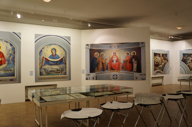 Здесь собраны эскизы и картоны, репродукции сюжетов в натуральную величину, фотографии интерьеров. Несколько залов отданы картинам, пейзажам, портретам и жанровым композициям живописцев, работавших на Святой Горе.
