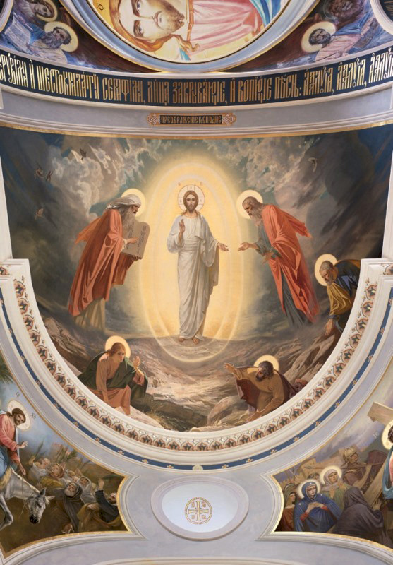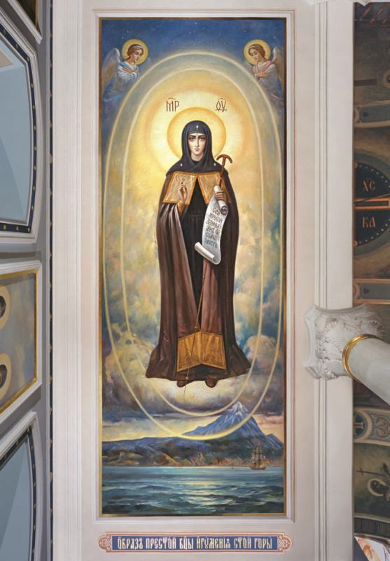 Афон в истории Русской Церкви — одно из главных направлений в наших сюжетах. Всего их более восьмидесяти, и 95 процентов из них несут новые композиционные решения. Назову хотя бы образ Божией Матери Светописанный — по явлению Ее перед вратами русского монастыря в 1903 году. Он помещен на одном из сводов.
