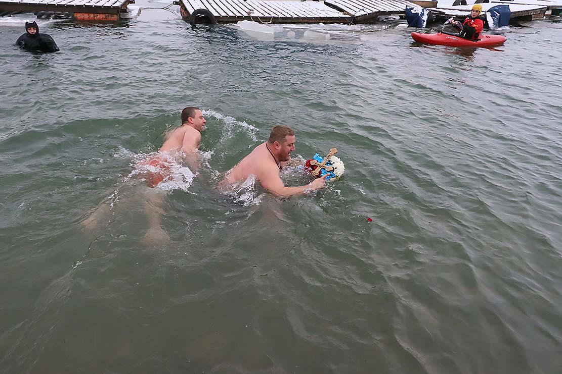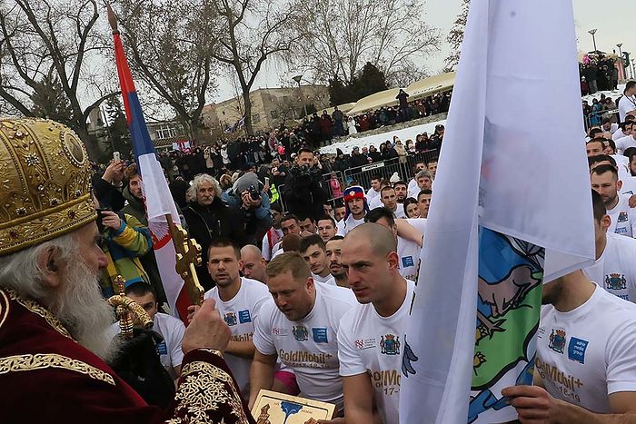 По освећењу знамења у спомен првим пливачима за Часни крст, Његова Светост се упутио ка дунавској обали где је у присуству великог броја житеља српске престонице благосиљао девојке и младиће који су неустрашиво пливали у леденој води у славу и част Оца и Сина и Духа Светога који се јавише на данашњи на реци Јордану.