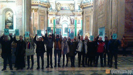 Акцию провели около 20 протестующих, отмечает издание. Активисты достали листы бумаги с напечатанными на них крупными буквами, составив надпись «Музей — городу!». В то же время другие стали фотографироваться на фоне священнослужителей.