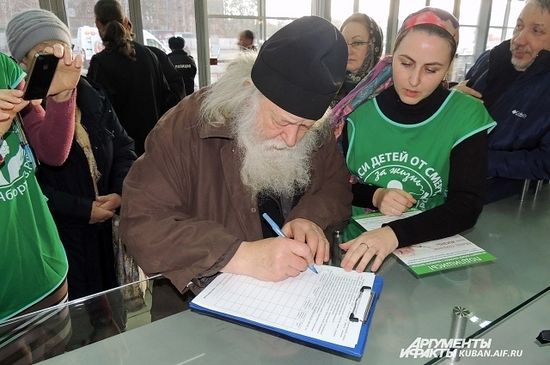 Перед началом встречи отец Валериан поставил свою подпись за запрет абортов. Фото: АиФ/ Александр Власенко