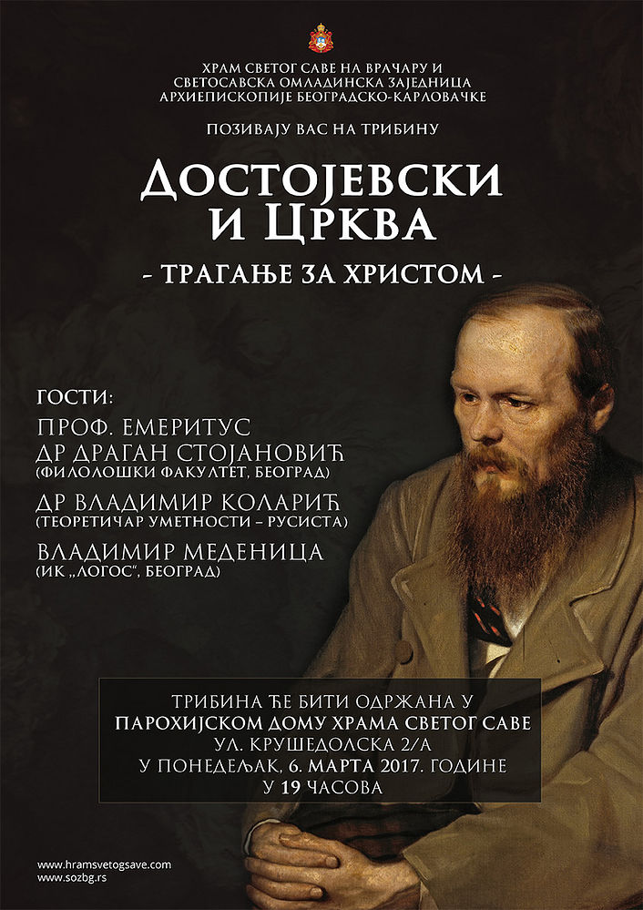 Позивамо вас, да у понедељак, 6. марта 2017. године, у 19 часова, у парохијском дому Храма Св. Саве (Крушедолска 2/А) присуствујете трибини на тему „Достојевски и Црква: трагање за Христом“.
