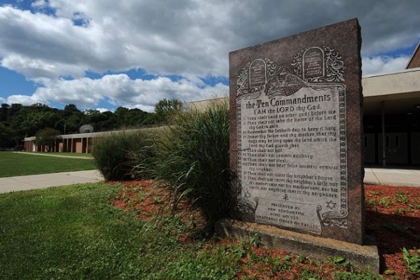 The Ten Commandments have stood at the school since 1956 when a local branch of the Fraternal Order of the Eagles gifted it to the district following the release of the movie “The Ten Commandments.”