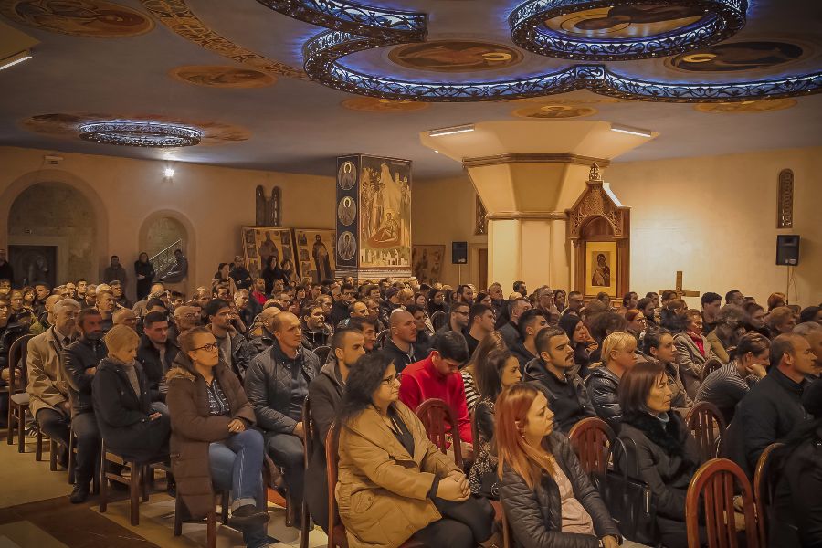 Пред бројним аудиторијумом уводну ријеч узео је протојереј Предраг Шћепановић, који је пожелио топлу добродошлицу архимандриту Сави, а након тога је предавач узео ријеч, па је тиме и отпочело предавање.