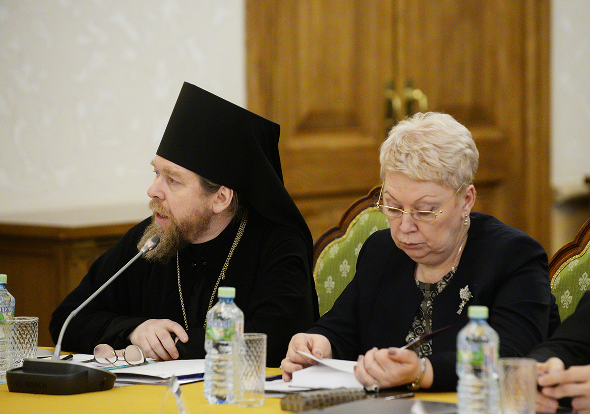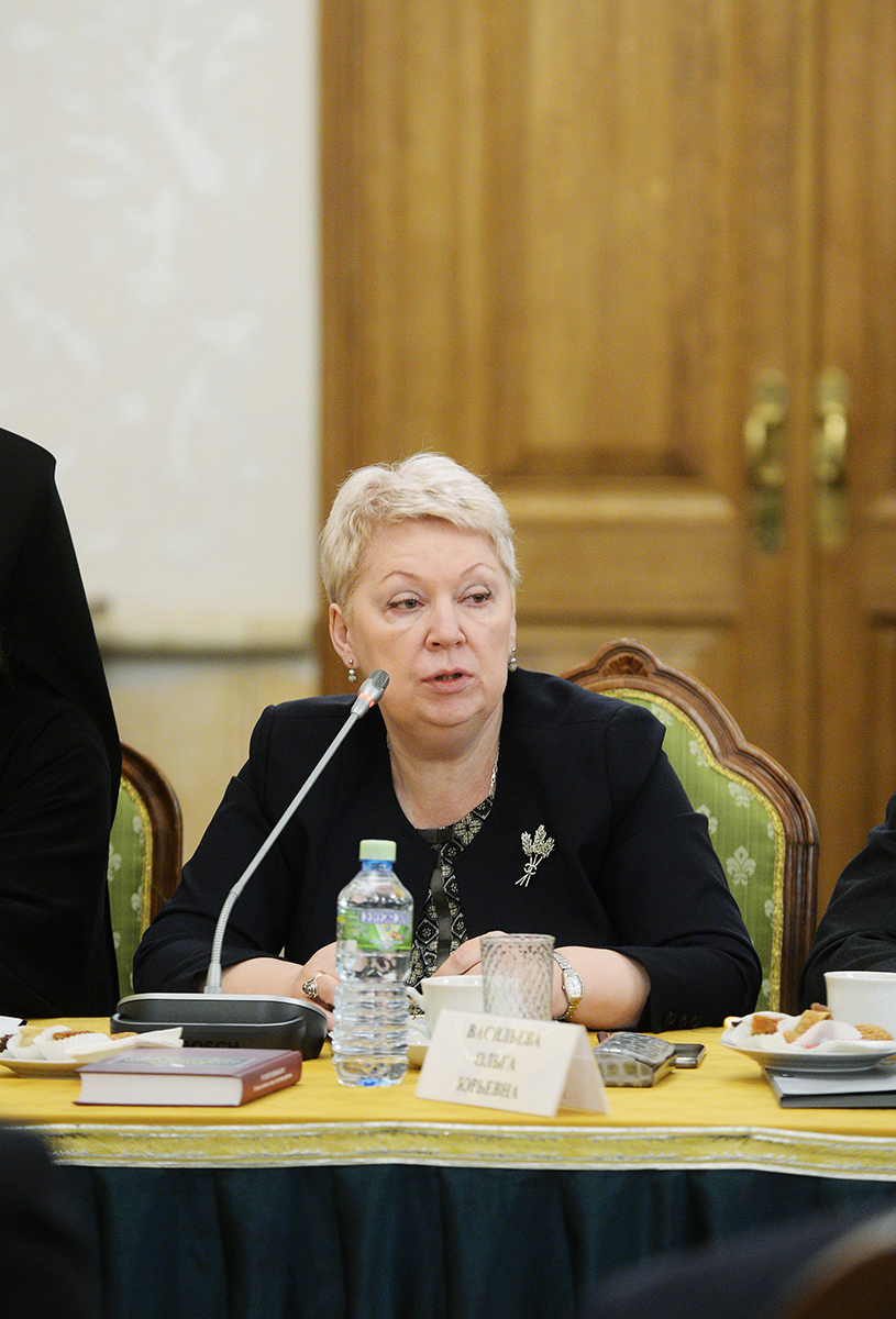 Далее состоялось обсуждение доклада О.Ю. Васильевой. В нем приняли участие Святейший Патриарх Кирилл, Л.А. Вербицкая, А.Д. Беглов, епископ Егорьевский Тихон, В.Р. Легойда и др.