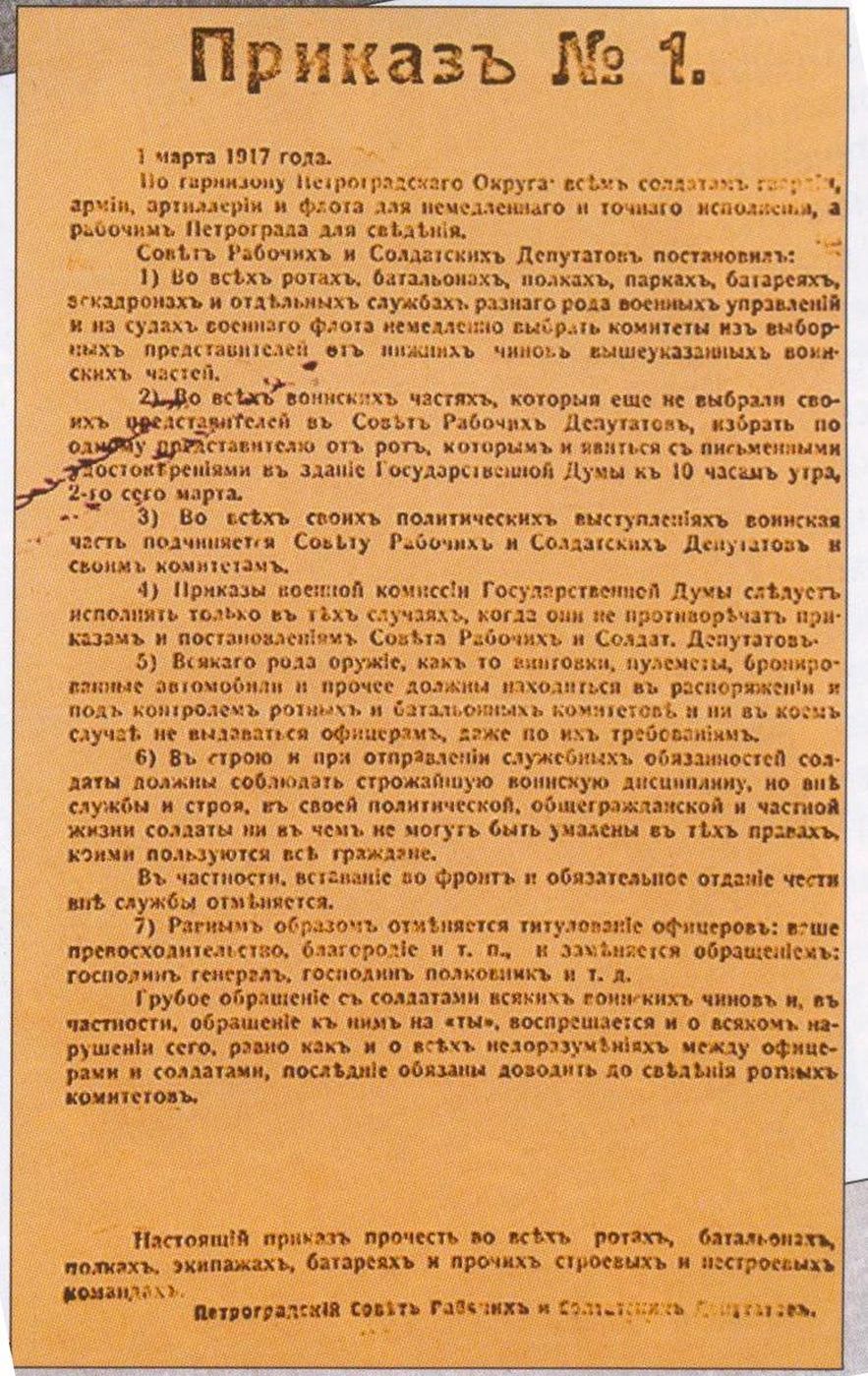 1 марта Петроградский совет издал резолюцию, которая вошла в историю под названием «Приказ № 1». В нем предписывалось в целях защиты революции провести в армии реформу, фактически лишавшую ее боеспособности, а именно: солдаты обязаны были образовать солдатские ротные, батальонные и полковые комитеты; впредь войска должны были подчиняться по всем политическим вопросам Совету рабочих и солдатских депутатов, а в каждой части и подразделении – солдатским комитетам; приказы Временного комитета Думы армия должна была исполнять лишь после их санкционирования Петроградским Советом. Приказом № 1 предписывалось держать оружие под контролем солдатских комитетов и не выдавать его офицерам; вводилось равноправие солдат и офицеров вне строя, отменялось титулование офицеров и отдание чести. В Петроградском гарнизоне, который объявил о своем подчинении Совету, этот приказ был проведен в самый день его издания, а на следующий день он был опубликован.