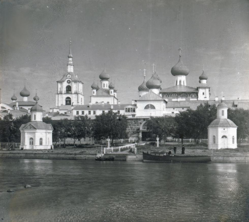 Solovetsky Transfiguration Monastery, west view. From left: Refectory Church of Dormition; Chapel of St. Alexander Nevsky; bell tower; Church of St. Nicholas; Church of Annunciation; west wall & Holy Gate; Transfiguration Cathedral; Chapel of Sts. Peter & Paul. Summer 1916. / Photo: Sergei Prokudin-Gorsky