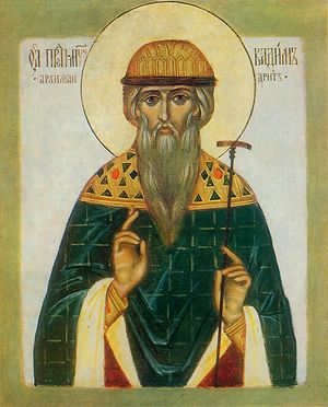 Monk Martyr Archimandrite Bademus (Vadim) was born in the fourth century in the Persian city of Bithlapata, and was descended from a rich and illustrious family. In his youth, he was enlightened with the Christian teaching. The saint gave away all his wealth to the poor and withdrew into the wilderness, where he founded a monastery. He would go up on a mountain for solitary prayer, and once was permitted to behold the Glory of God.