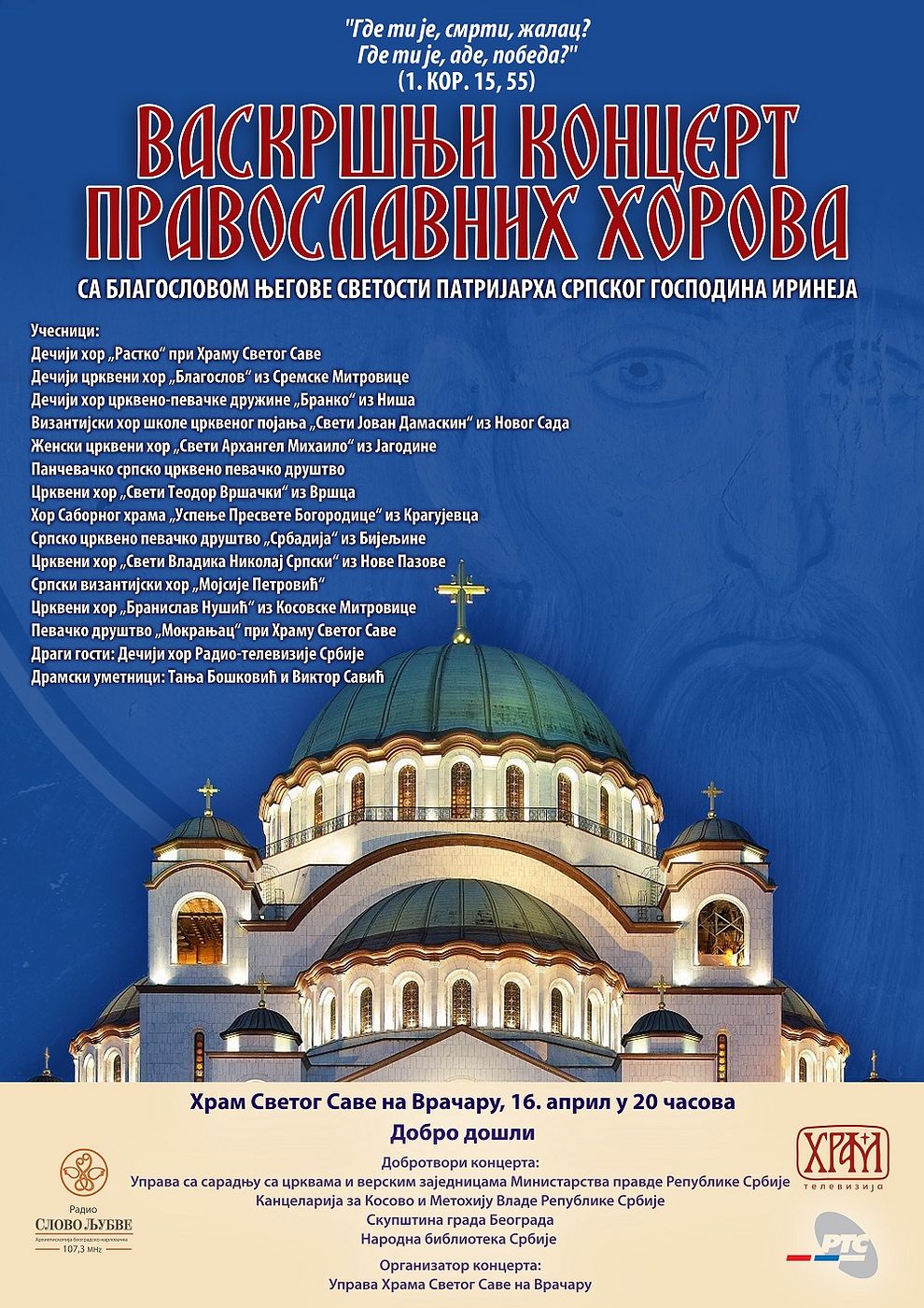 Васкршњи концерт православних хорова у храму Светог Саве на Врачару под називом Где ти је, смрти, жалац? Где ти је, аде, победа? (1. Кор. 15, 55) биће одржан на Васкрс, 16. априла, од 20 часова са благословом Његове Светости Патријарха српског Господина Иринеја, а у организацији Управе Храма Светог Саве на Врачару.