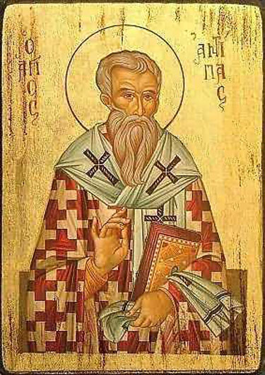 The Hieromartyr Antipas, a disciple of the holy Apostle John the Theologian (September 26), was bishop of the Church of Pergamum during the reign of the emperor Nero (54-68).
