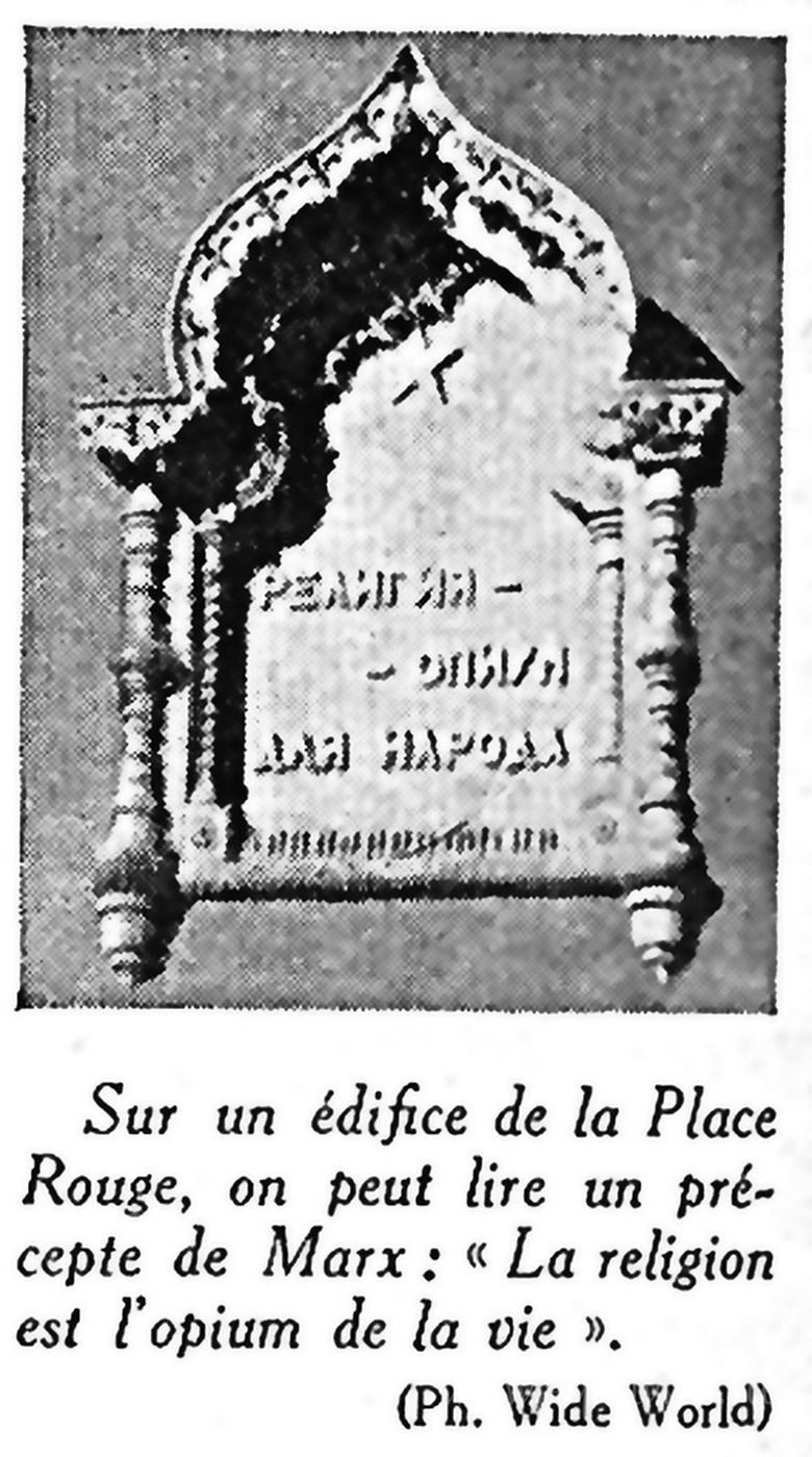 Барельеф с цитатой из Карла Маркса «Религия — опиум для народа» был установлен в 1918–1920 годах на здании 2-го дома Советов (бывшей Городской думы), на месте вынутой стенной иконы. Атеистическое «просвещение» было важной частью плана монументальной пропаганды, выдвинутого Лениным в 1918 году. Среди других осуществленных в рамках этого плана проектов: изображение Самсона, разрушающего храм, — на угловой башне ограды Главного управления архивов (угол Моховой улицы и Воздвиженки); доска-рельеф со словами анархиста П.А. Кропоткина «Вся наша надежда покоится на тех людях, которые сами себя кормят» — на стене Рождественского монастыря; надпись «Наука трудящимся» — на круглом фронтоне здания бывшей университетской церкви на Моховой улице.
