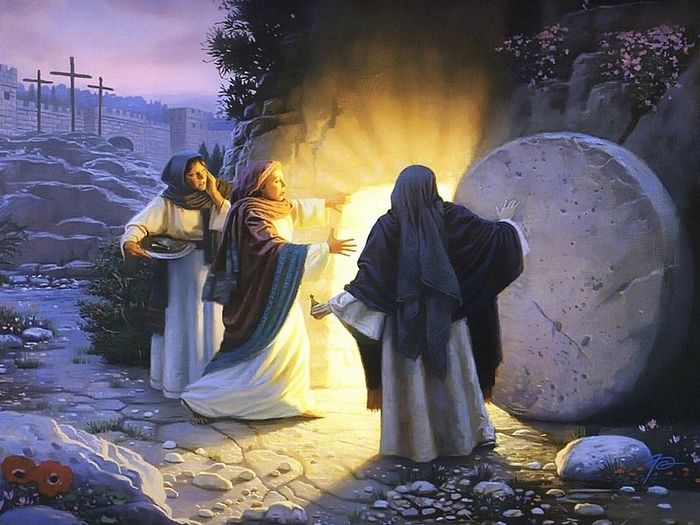 Эти женщины следовали за Христом во дни Его земной жизни и пошли за Ним до самого конца — на Голгофу. Они видели Его страшное распятие и смерть, проводили Его «в последний путь», а потом снова собрались, ранним утром, когда ночная тьма еще покрывает землю, ко гробу, чтобы закончить погребальный обряд — по иудейскому обычаю помазать тело усопшего благовониями.