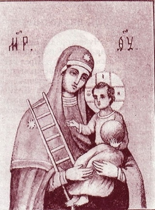 During the times of militant atheism, the original icon, along with many other holy treasures of the Russian Orthodox Church, was lost. There remained only illustrations in pre-Revolutionary publications, where the Mother of God was depicted with the Pre-eternal Infant, holding an orb—a symbol of the Pantocrator [Christ the All-Soveriegn]—in His left hand. Behind the right hand of the Mother of God is a ladder, symbolizing the joining of the earthly with the Heavenly through the Nativity of the Savior. A similar depiction is found on the Molchensky Icon of the Most-holy Theotokos.