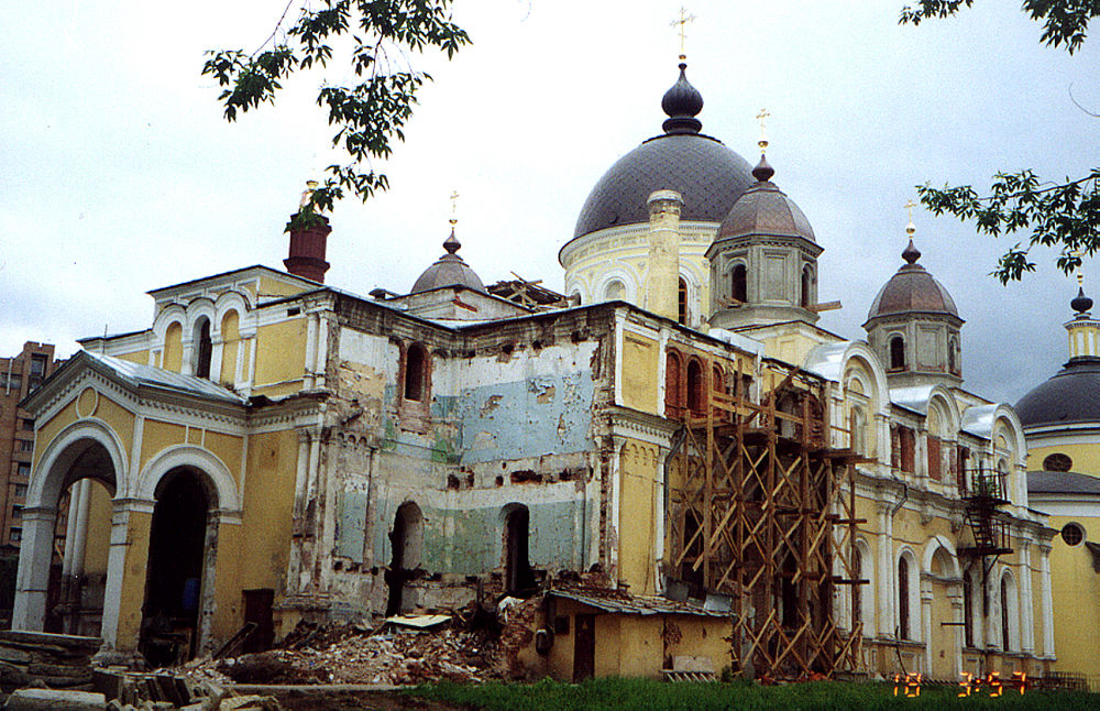 Жили мы в алтаре еще не освященных приделов – центрального и правого, а службы проходили в левом приделе храма. Сестры сами пели, кухня располагалась в правом приделе. Конечно, тяжело приходилось. Не было самого необходимого, даже хлеба насущного. Территория монастыря была открыта, на ней постоянно стояли машины арендаторов, бездомные люди жили рядом с храмом, по ночам жгли костры. Но Господь не оставил Своих чад. Сначала на восстановление монастыря собирали в метро. Москвичи уже узнали, что монастырь восстанавливают, и начали помогать. В храме установили стекла вместо фанеры, стали выгребать хлам, ломать толстые стеклянные перегородки, на территории сгребали опавшие листья, мусор. Когда нам наконец передали Воскресенский храм, он был настолько захламлен и обезображен, что пришлось вывезти больше ста грузовиков с мусором. Очень большой вклад в восстановление монастыря внес бывший Префект ЦАО А.И. Музыканский, который помог в освобождении от арендаторов, в выпуске постановлений о передаче территории и зданий монастырю.