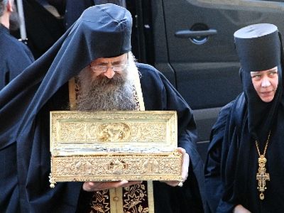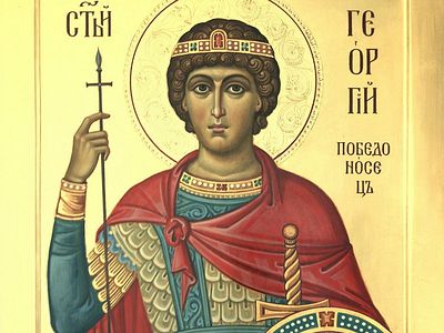 The Greatmartyr George, for his valour and his spiritual victory over his torturers, who could not force him to renounce Christianity, and likewise for his wonderworking assistance to people in danger, is additionally called the "Trophybearer." The relics of St. George the Trophybearer were placed in the Palestinian city of Lydda, in the church that bears his name, while his head was preserved in Rome, in the church that is also dedicated to him.