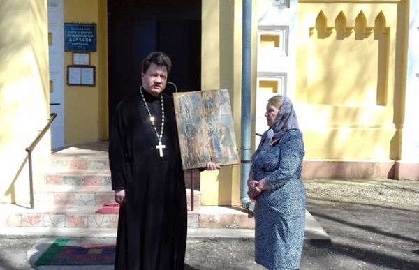 Накануне Дня Победы Светлана Владимировна привезла икону в Успенский храм поселка Монастырщина. По словам настоятеля храма, протоиерея Андрея Никитенкова, икона нуждается в реставрации.