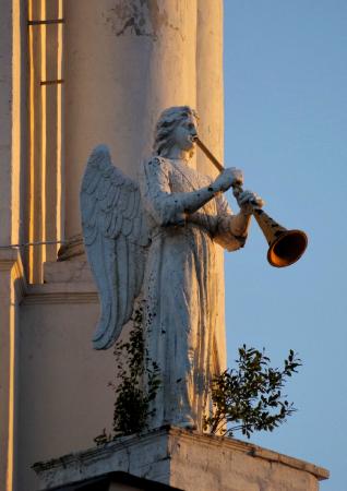 И здесь тоже ангелы есть, да не один, а целых четыре, по бокам первого яруса колокольни. Эти ангелы летят навстречу нам. В руках у них трубы, они трубят, зовут к чему-то.