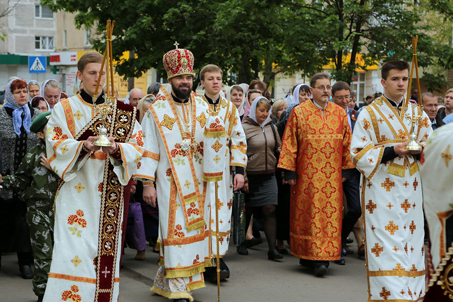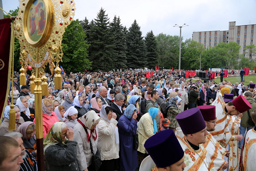 Сразу по окончании литургии духовенство и сотни горожан проследовали крестным ходом в сквер Героев. Здесь у стелы воинам-освободителям и часовни святого мученика Виктора митрополит Митрофан совершил панихиду по всем погибшим в Великой Отечественной войне — «вождям и воинам, за веру и Отечество на поле брани жизнь свою положивших, от ран и глада скончавшихся, в пленении и горьких работах невинно умученных и убиенных и всех, победы ради потрудившихся». Были вознесены молитвы и о жертвах междоусобной брани на Украине.