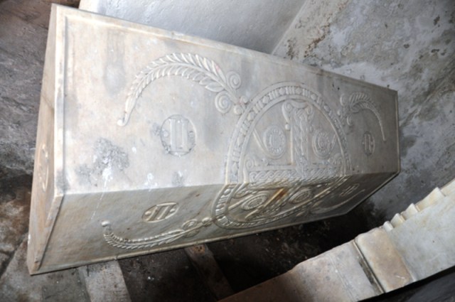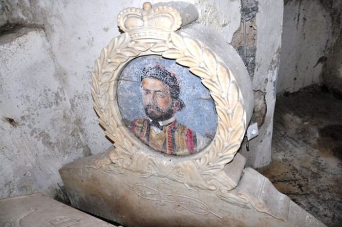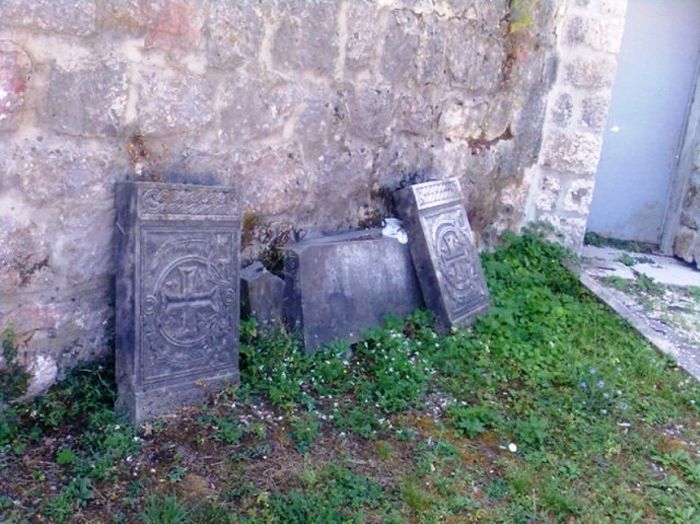 Странице гробнице се налазе у дворишту и до скора су служила да се подупиру тешка дворишна врата. Надгробна плоча и надгробни мозаик са Његошевим ликом су побацани у једној од кула Биљарде.