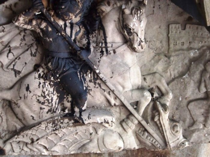 Рељеф Светог Ђорђа (крсне славе светородне лозе Петровић Његош) који је био изнад улазних врата капелице посут мазутом, поломљени крст са капелице, кандило, полијелеј и врата са разорене цркве Светог Петра Цетињског који данас пропадају разбацани у котларници зграде престонице Цетиње.