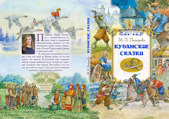 Пискунова М. П. Кубанские сказки / М. П. Пискунова ; Худож. В. П. Коркин. — М. : Изд-во Сретенского монастыря, 2017. — 64 с. : ил. — (Чудесные истории). В книге собраны истории о том, как жили на Кубани казаки, во что верили, чем дышали. В сказочный узор сложились обычаи и нравы жителей кубанской земли, истории из станичных летописей и быта казаков. Это память о тех, кто жил две сотни лет назад, об их благородстве и верности.