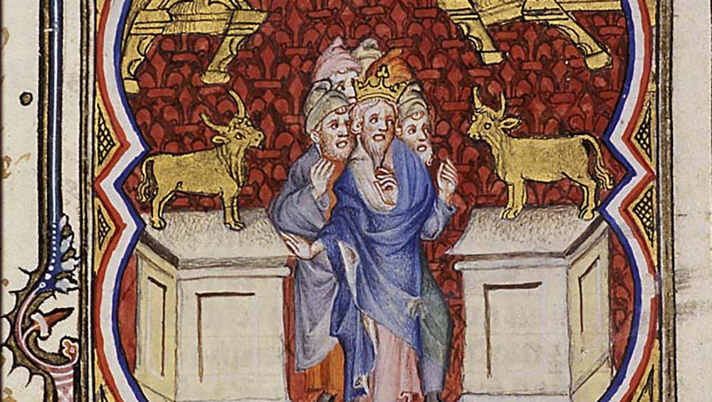 Иеровоам устанавливает золотых тельцов и провозглашает независмость от Иудеи. Фаргмент манускрипта, XIV в. По смерти царя Соломона произошло разделение на два государства: двухколенное Иудейское и Израильское, в состав которого входило десять колен. Престол царя Давида наследовал внук его Ровоам. Иисус, сын Сирахов, говорит о печальных последствиях этого правления: Соломон оставил по себе от семени своего безумие народу, скудного разумом Ровоама, который отвратил от себя народ чрез свое совещание, и Иеровоама, сына Наватова, который ввел в грех Израиля и Ефрему указал путь греха (Сир 47, 27–29).