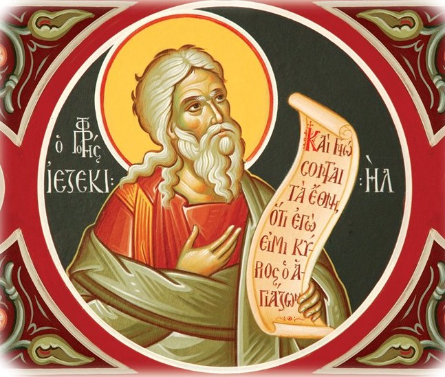 Он был священником. Халдеи отвели его в плен еще в 597 году, когда ему было около тридцати лет. Жил Иезекииль в поселении при реке Ховаре, впадающей в Евфрат. В пятый год его плена Господь призвал Иезекииля к пророческому служению. Призвание сопровождалось явлением славы Божией. Пророк увидел отверстые небеса и из среды огня четырех животных: Подобие лиц их — лице человека и лице льва с правой стороны у всех их четырех; а с левой стороны лице тельца у всех четырех и лице орла у всех четырех (Иез 1, 10). По толкованию святых отцов, животные символически изображали апостолов-евангелистов: ангел, лев, телец (бык), орел.