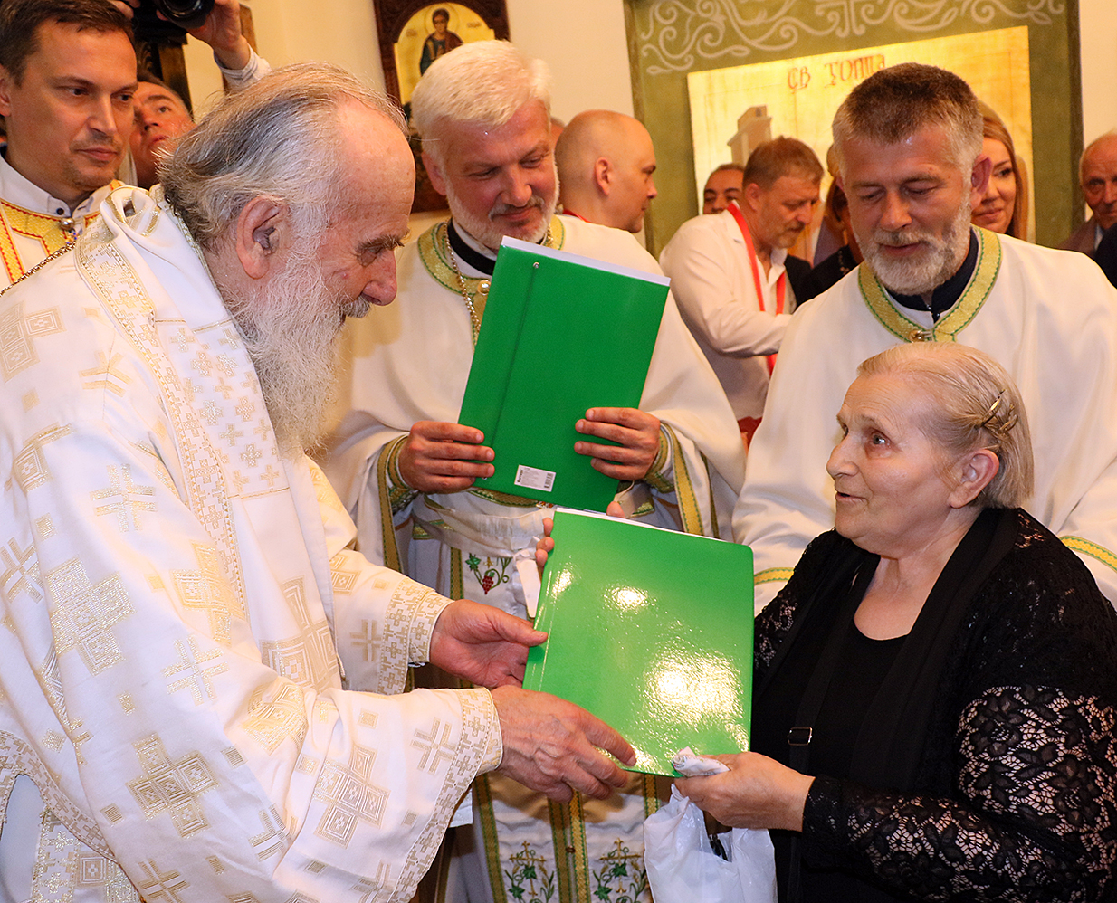 Патријарх је уручио грамате капетану Петру Ђорђевићу, господи Дејану Масликовићу, Милети Цветковићу, Зорану Булатовићу, Ненаду Пендићу, Стевану Хејлу и Радомиру Ђукићу, као и гђи Мирјани Мирковић, гђи Добрили Ђурасек и гђи Стојанки Јовановић за несебичну љубав према Мајци Цркви због пружене помоћи при изградњи Парохијског дома.